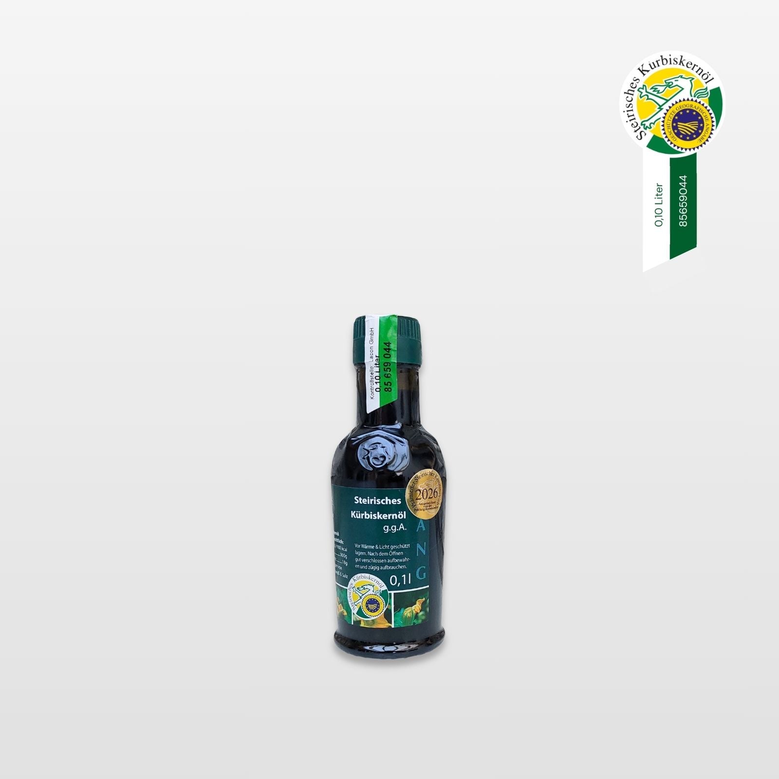0,1 Liter Steirisches Kürbiskernöl g.g.A. Unsere "Kostprobe": Die 0,1-Liter-Flasche mit dem steirischen Panther - prämiert mit der Goldplakette 2026! Unser... Lesen Sie mehr