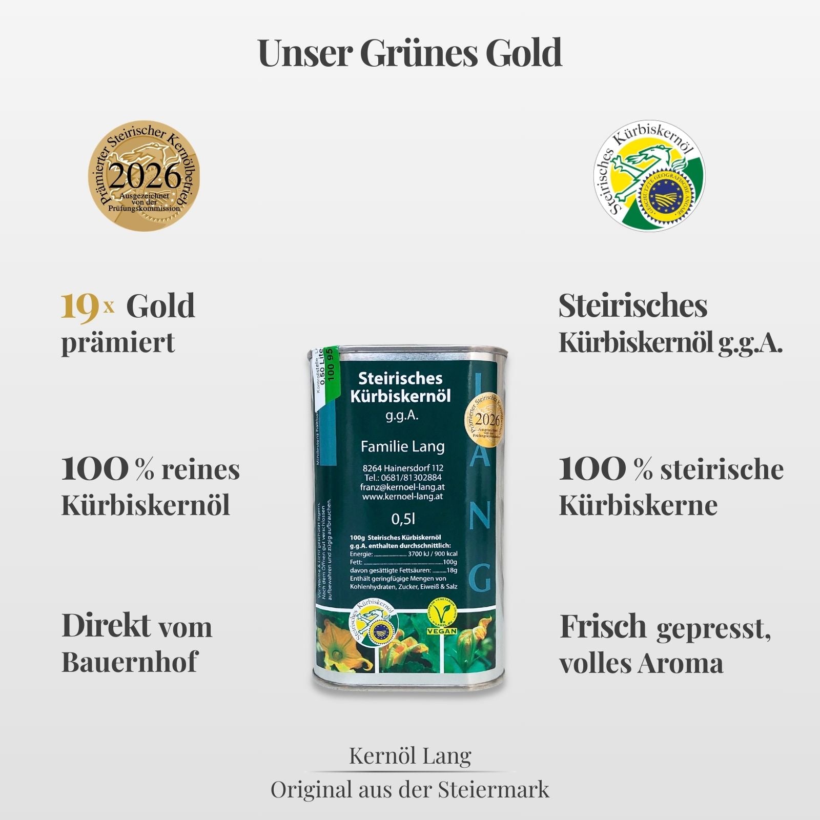 Durch die Prämierung 2026 dürfen wir unsere Flaschen mit der Prämierungsetikette in Gold schmücken. Die Jury bewertete unser Kernöl mit der vollen Punktezahl!